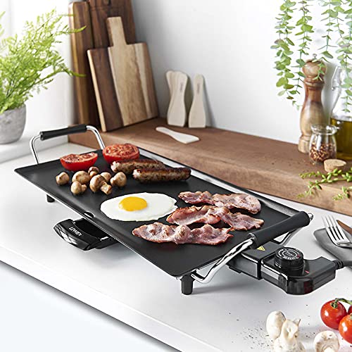 - DURABLE AND EASY TO CLEAN – This versatile electric griddle plate is made from stainless steel that is durable, resistant to corrosion and easy to clean. The sturdy electric grill is cleaned effortlessly during and after use; as spills and stains can be simply washed away with a wet wipe, cloth or piece of kitchen roll. The high-powered electric table top grill is lightweight, easily transported to alternative locations and is compatible with all cookware.