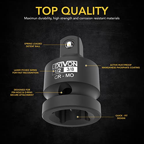 Product Description Here’s How You Can Make Your Job Easier & Save Your Money With Our Adapter Reducer Kit: If you need a set of impact socket adapters for your auto repair shop, if you are looking for a set of strong and reliable heavy-duty reducers for your home improvement projects, if you want a set of impact driver conversions for your DIY projects, then the LEXIVON 4-piece adapter and reducer kit will help: MAKE YOUR JOB EASIER: our premium reducer/adapter set includes: 1/4""(F) to 3/8""(M) - 3/8""(F) to 1/4""(M) - 3/8""(F) to 1/2""(M) - 1/2""(F) to 3/8""(M). SAVE YOUR MONEY: tired of spending a small fortune on flimsy impact tool accessories? Our socket reducers are made from robust Chrome Molybdenum that will pass the test of time. What Makes The LEXIVON Adapter & Reducer Set So Special? Rustproof Construction – prevent rust and corrosion with the smart Manganese Phosphate coating.Spring-Loaded Detent Ball System – securely and firmly fit your drive sockets to your power tool.Laser-Etched Sizes – easily identify the different sizes and save your precious time while working.Convenient Tray – keep your impact socket adapters neatly organized in the handy tray.Impact Grade Design – use our universal adapters with all your cordless drills or impact guns. Top 3 Reasons To Choose Our Impact Adapter & Reducer Set: Because You Want To Save Time: take all the fuss out of your auto repair tasks and finish any job faster with our adapter set.Because You Need Dependable Tools: unlike all those cheaply-made socket reducers, our professional socket adapters/reducers set will past the test of time.Because They Are Perfect For Professionals: use your Cr-Mo steel sockets for automotive repair, home maintenance or DIY projects. LEXIVON impact wrench adapter and reducer LEXIVON Premium Impact Universal Joint Set Three Piece Ball Spring Design LEXIVON Impact Socket Adapter LEXIVON Impact Socket Adapter LEXIVON Impact Socket Adapter Model # LX-112 LX-113 LX-401 LX-402 LX-403 Quantity per set 4 piece 3 piece 1 piece 1 piece 2 piece Sizes included (CM) 6.35mm to 9.5mm 9.5mm to 6.35mm 2.7mm to 9.5mm 9.5mm to 12.7mm 6.35 mm, 9.5 mm, 12.7 mm 12mm(F) To 19mm(M) 19mm(F) To 12mm(M) 12mm(F) To 19mm(M)- 19mm(F) To 12mm(M) Included sizes (INCH) 1/4""(F) to 3/8""(M) 3/8""(F) to 1/4""(M) 3/8""(F) to 1/2""(M) 1/2""(F) to 3/8""(M) 1/2", 3/8", And 1/4" 1/2" Female to 3/4" Male 3/4" Female to 1/2" Male 1/2" Female to 3/4" Male & 3/4" Female to 1/2" Male MATERIAL Chrome molybdenum alloy steel Chrome molybdenum alloy steel Chrome molybdenum alloy steel Chrome molybdenum alloy steel Chrome molybdenum alloy steel LEXIVON 1/2 inch for alloy rims (12.7mm),6 wheel nuts sizes in inch and cm Impact Driver Extension Set, 3/8 (9.5mm) Impact Driver Extension Set, 1/2 (12.7mm) Impact wrench extension bar Adjustable 3 positions Model # LX-111 LX-114 LX-115 LX-116 Quantity per set 4 piece 3 piece 3 piece 1 piece Sizes included (CM) 17 mm, 19 mm, 21 mm & 3/4"", 13/16"", 7/8"" + 3"" Extension Bar 75mm, 150mm, 200mm 75mm, 150mm, 200mm 250mm Included sizes (INCH) -- 3", 6", and 8" 3", 6", and 8" 10" MATERIAL Chrome molybdenum alloy steel Chrome molybdenum alloy steel Chrome molybdenum alloy steel Chrome molybdenum alloy steel 3" drill to socket adapter set 3" drill to insert adapter set (pack of 2) 3" & 6" drill to bit adapter set 3", 6", & 12" Drill to Insert Adapter Set 6" Drill to bit adapter set 12" Drill to bit adapter set Part number LX-101 LX-101X2 LX-105 LX-106 LX-102 LX-103 Quantity 3-piece 6-piece 6-piece 9-piece 3-piece 3-piece Length / inch 3 inch 3 inch 3 inch, 6 inch 3-inch, 6-inch, 12-inch 6-inch 12-inch Length / CM 7,5cm 7,5cm 7,5cm + 15cm 7,5cm + 15cm+ 30cm 15cm 30cm Drive size 1/4-inch, 3/8-inch, 1/2-inch 1/4-inch, 3/8-inch, 1/2-inch 1/4-inch, 3/8-inch, 1/2-inch 1/4-inch, 3/8-inch, 1/2-inch 1/4-inch, 3/8-inch, 1/2-inch 1/4-inch, 3/8-inch, 1/2-inch Drive size / CM 6,35 mm, 9,5 mm, 12,7 mm 6,35 mm, 9,5 mm, 12,7 mm 6,35 mm, 9,5 mm, 12,7 mm 6,35 mm, 9,5 mm, 12,7 mm 6,35 mm, 9,5 mm, 12,7 mm 6,35 mm, 9,5 mm, 12,7 mm 1/4 inch hexagonal shank ✓ ✓ ✓ ✓ ✓ ✓ Chrome vanadium steel - Black phosphate coating ✓ ✓ ✓ ✓ ✓ ✓ Spring-loaded locking ball secures the sockets in place ✓ ✓ ✓ ✓ ✓ ✓ Standard ANSI / ASME / DIN ANSI / ASME / DIN ANSI / ASME / DIN ANSI / ASME / DIN ANSI / ASME / DIN ANSI / ASME / DIN LEXIVON HEX bit socket set (metric) LEXIVON HEX Bit Socket Set (SAE) LEXIVON HEX Bit Socket Set (Star) LEXIVON Master HEX Bit Socket Set (SAE and Metric) LEXIVON Triple Square Spline Bit Socket Set LEXIVON Tamper Proof Torx Bit Socket Set LX-141 LX-142 LX-143 LX-144 LX-145 LX-146 13 piece 13 piece 13 piece 32 piece 10 piece 13 piece Chrome Vanadium Alloy Steel Bright Chrome Plated Chrome Vanadium Alloy Steel Bright Chrome Plated Chrome Vanadium Alloy Steel Bright Chrome Plated Chrome Vanadium Alloy Steel Bright Chrome Plated Chrome Vanadium Alloy Steel Bright Chrome Plated Chrome Vanadium Alloy Steel Bright Chrome Plated First-class S2 alloy steel treatment of zinc phosphate bits First-class S2 alloy steel treatment of zinc phosphate bits First-class S2 alloy steel treatment of zinc phosphate bits First-class S2 alloy steel treatment of zinc phosphate bits First-class S2 alloy steel treatment of zinc phosphate bits First-class S2 alloy steel treatment of zinc phosphate bits 1/4” Drive: 2mm, 2.5mm, 3mm, 4mm, 5mm, 5.5mm, 6mm; 3/8” Drive: 7mm, 8mm, 9mm, 10mm, 12mm; 1/2” Drive: 14mm 1/4” Drive: 5/64”, 3/32”, 1/8”, 5/32”, 3/16”, 7/32”, 1/4”; 3/8” Drive: 9/32”, 5/16”, 3/8”, 7/16”, 1/2”; 1/2” Drive: 9/16” 1/4” Drive: T8, T10, T15, T20, T25, T27, T30 3/8” Drive: T40, T45, T47, T50, T55 1/2” Drive: T60 Metric 1/4”: 2, 2.5, 3, 4, 5, 5.5, 6mm 3/8”: 7, 8, 9, 10, 12mm 1/2” : 14, 15, 17, 19mm SAE 1/4”: 5/64”, 3/32”, 1/8”, 5/32”, 3/16”, 7/32”, 1/4”; 3/8”: 9/32”, 5/16”, 3/8”, 7/16”, 1/2”; 1/2”: 9/16”, 5/8”, 11/16”, 3/4