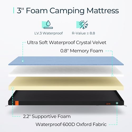 - Durable Comfort: Our foam sleeping pad is made from 0.8” memory foam and 2.2” supportive foam. The memory foam aims to provide comfort by contouring the shape of your body. And the high density foam also gives you great support and increase comfort.