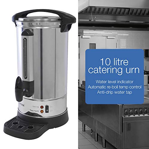 - 10 LITRE CAPACITY (APPROX. 40 CUP): The large 10L capacity makes approximately 40 cups, providing customers, guests and employees with hot drinks quickly and effortlessly when they need it with no mess. The catering urn is made from high quality stainless steel in an elegant, simple design and makes an excellent addition to any domestic or commercial kitchen. Design includes handy water level gauge, carry handle, anti-drip tap, concealed element, drip tray and locking twist lid.