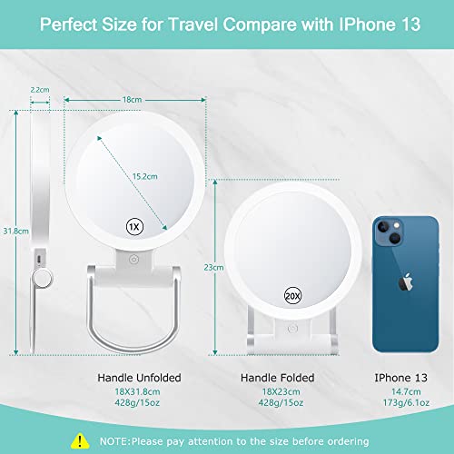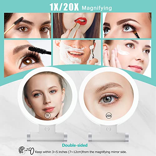 - 🔍【Double-Sided 1X/20X Magnification】The 20X travel magnifying mirror is powerful, you will find no more missing smudged eye makeup, unseen blemishes, stray hairs, or small specks between your teeth. This LED makeup mirror helps you make sure everything on your face is exactly how and where it should be. The regular side could display the entire face in high definition to meet your daily needs.