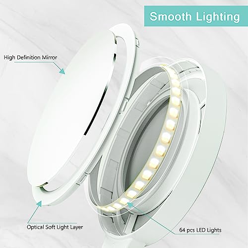 - 💎【Elegant & Portable】Our portable travel mirror with lights and magnification has an elegant appearance, with a glossy white shell, a chrome finish stand, and a stylish modern design. The desk mirror with light weighs only 428g and is 18cm in diameter. It is lightweight, and handy making it easy for you to put them in a handbag, shoulder bag, backpack or suitcase, and more.