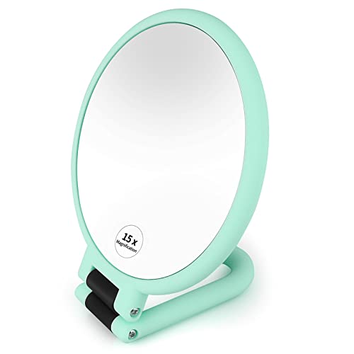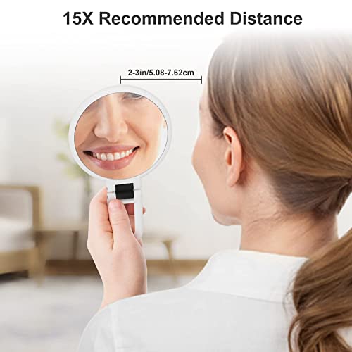 - 15X 1X MAGNIFICATIONS AND DUAL SIDES: This hand-held makeup mirror has 15x magnification on one side and 1x magnification on the other side. It is very suitable for full makeup and presents a clear visual effect on specific facial details.