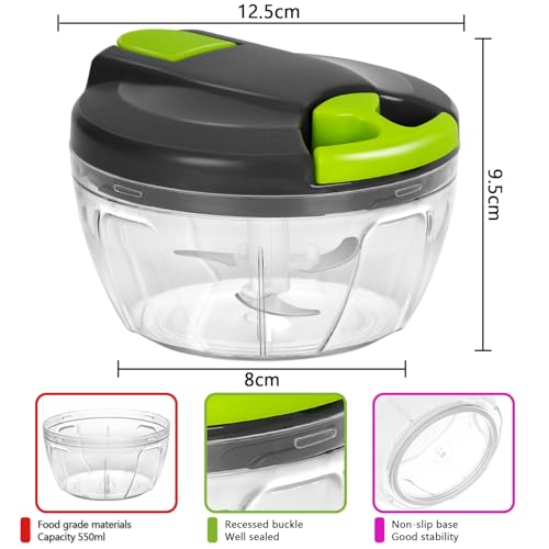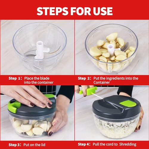 - 【SAFE AND RELIABLE】Manual food chopper are made of high-quality food-grade PP material and high-quality stainless steel, which is safe for daily use. Garlic grinder high quality nylon drawstring, durable and easy to rebound. The hand chopper lid has a safety lock that securely attaches it to the bowl. The vegetable chopper non-slip bottom keeps the shredder from slipping off the counter.