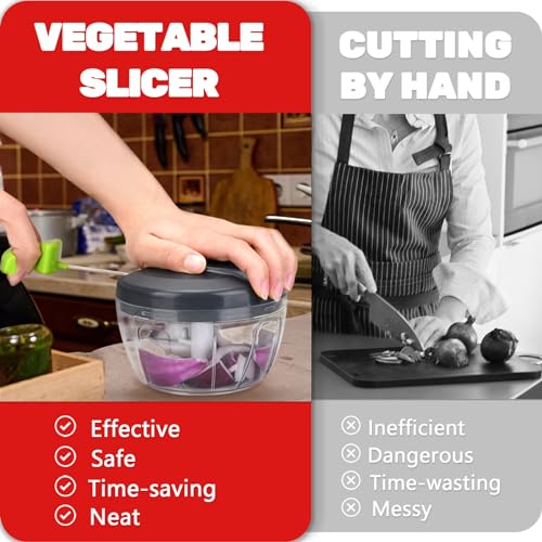 - 【SUITABLE FOR KITCHEN】The food chopper can be used to chop vegetables, fruits, meat, etc. Onion cutter is a good helper for the kitchen.You can control the size of foods by controlling the number of times you pull string. Food choppers and dicers10 times for coarse chopping, 15 times for medium, and 20 times or more for puree. What’s more, You can get chopped Onions in seconds without crying, and chopping garlic without smell.