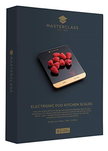 From the manufacturer Cook with Confidence Experiment, create and accomplish: with outstanding design, premium quality and a passion for food, MasterClass helps you cook with confidence. MasterClass Small Portable Food Scales (5 kg / 11 lbs / 5.2 L) When you're cooking and baking, closely following recipes: accuracy is everything. But so is space - especially when you don't have much of it to work with in your kitchen. With a compact, space-friendly design and modern technology, MasterClass's digital kitchen scales provide a stylish and practical solution. Roughly the size of a tablet computer, they measure 22 x 16 x 2 cm (8½ x 6½ x 1 inches). So, they won't take up the worktop room a traditional mechanical set of scales need, freeing up lots of valuable space. You don't have to rely on guesswork. These small scales feature precision sensors, which accurately measure your dry and liquid ingredients, so you can follow your favourite recipes to the letter. Useful Information: Measures 22 x 16 x 2 cm (8½ x 6½ x 1 inches) Weighs up to 5 kg (11 lbs / 5.2 L) Powered by 3 x AAA batteries (not included) Wipe clean only Weigh with Accuracy Butter and flour for a shortcrust pastry case, stock and chopped vegetables for a Moroccan tagine, a mixture of summer fruit berries for a compote: with these small digital kitchen scales, you can accurately weigh all of your ingredients with ease. Simply place your ingredients on the weighing platform: though compact, its surface is large enough to measure wet and dry ingredients in bowls. Or you can weigh your dry ingredients, such as nuts, seeds and berries, directly on platform. You can measure multiple ingredients in the same bowl too. These small food scales feature add 'n' weigh functionality. This means you can simply touch the TARE button when you add a new ingredient - for a quick yet accurate way to weigh. It's also handy for zeroing the weight of your bowls, so you can just measure the ingredients within. Key Features Easy-to-read LCD Weigh just the amount you need, and not a gram more: the scales feature a black display with a bright red readout. So, you can easily keep tabs on the measurements from the quickest of glances. Portability With their size, these small kitchen scales are perfect for when you're following a strict diet. Stow them in a bag to use - wherever you are. You can weigh your food and ingredients beforehand, to ensure you don't break your dietary guidelines. Touch-sensitive bamboo panel The scales' bamboo panel doesn't just provide a stylish point of contrast - sitting sleekly alongside the black surface. It's an easy-clean touch-sensitive panel, which allows you to cycle through the units of display, activate the TARE feature and turn them on / off. It displays pounds and ounces (lbs. oz), grams (g), fluid ounces (fl oz) and millilitres (ml). Gift boxed They come packed in MasterClass's gift box-style packaging, which naturally makes them the perfect present for any enthusiastic home chef. The box makes them easy to wrap too! At MasterClass, We Love Food Food is passion. Food is special. Food is everyday. Trust MasterClass to elevate your culinary experience - whether you're feeding a family, entertaining to impress, or striving to become the best home chef you can be. Established in 1850, MasterClass provides an extensive range of expert kitchen tools and gadgets, cookware and its acclaimed bakeware collection. Every product is designed with one simple goal in mind: to make great food accessible to anyone who cooks or wants to cook.