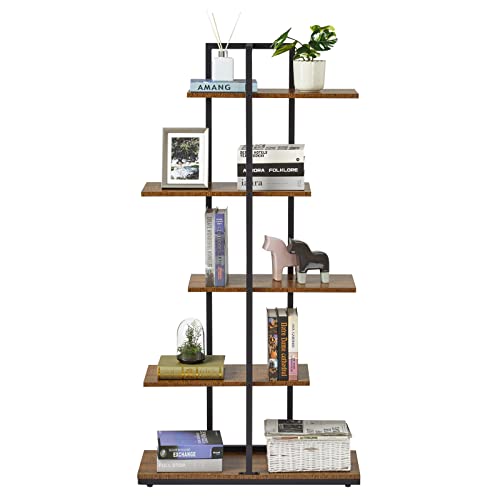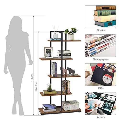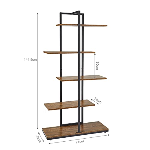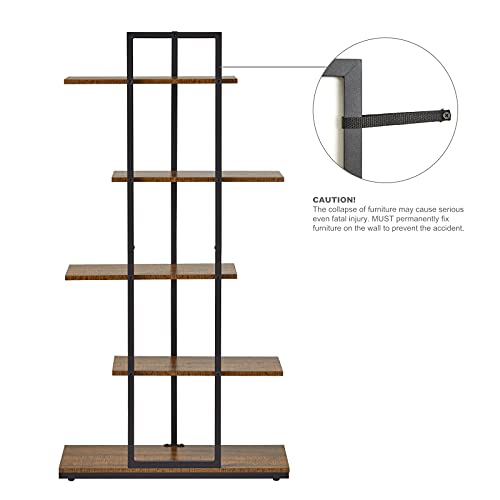 From the manufacturer Asymmetrical Staggered Bookcase Are you worried that you don't have a special place for your books or magazines, or you don't have enough space to fit a large shelf in your home? With 74 x 28 x 144.5cm size, this compact asymmetrical staggered bookcase will easily fit in your living room, bedroom or office.Benefiting from this modern industrial style and freestanding design, your books, CDs and magazines can be perfectly displayed to organize a cluttered desk and save space.In addition to store books, folders and other decorative items in the office, our bookshelf is also perfect for organizing photo albums and books in the children's room. Package Included: 1 x Bookshelf1 x Accessory kit1 x Installation tool1 x Installation instruction Product Specifications Material: 15mm particle board, triamine veneer and painted black-sand grain metal parts Net Weight: 11.3KG Gross Weight: 12.2KG Product Size: 74 x 28 x 144.5cm Maximum Load Capacity: 3KG (single layer) Total Maximum Shelf Weight: 20KG 1. Avoid direct sunlight, damage to the surface by sharp objects and prolonged water immersion. 2.Children are not allowed to climb or play for safety reasons; 3. It must be used against the wall with anti-dumping device. Stable Structure The shelves are supported at three points to ensure that this unique staggered shape can afford sufficient load-bearing capacity; with a high load-bearing capacity of 3KG per layer. Storage Space This charming bookcase features 5 tiers of open staggered shelving, providing ample capacity and a small footprint area. It can provide plenty of storage and display space for books, knick-knacks, family photos, decorative items. Freestanding Bookshelf The base is reinforced with an iron frame for excellent stability; The product has anti-slip sticker at the bottom to increase stability and protect the floor from friction. Anti-tip devic An anti-tip device is equipped to improve stability and reduce accidental injuries. Ladder Shelf Corner Shelf Tree Bookshelf S-shaped Shelf Dispaly Shelf Color Rustic Brown / Grey Rustic Brown / Grey Rustic Brown Rustic Brown Rustic Brown Dimensions 56 x 34 x 137.5 cm 34 x 34 x 125 cm 50 x 22 x 125cm 76 x 24 x 127.5 cm 74 x 28 x 144.5 cm Tier 4 4 9 5 5 Maximum Load Capacity 5 kg / Each Tier 5 kg / Each Tier 3 kg / Each Tier 10 kg / Each Tier 3 kg / Each Tier