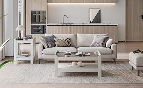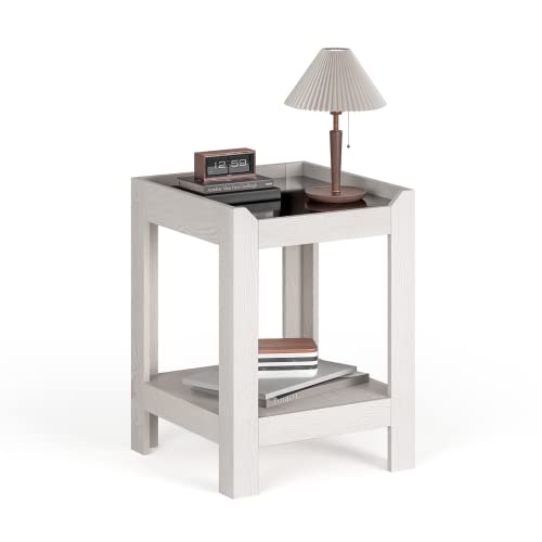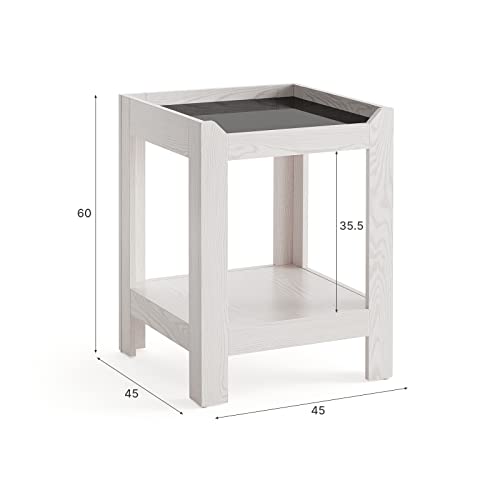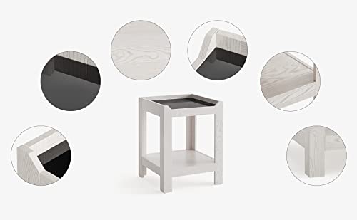 - [Warm Color Style] This end table is designed with creamy white finish with wood grain to create a very warm atmosphere. The black glass design idea adds some spunk to the warm atmosphere.