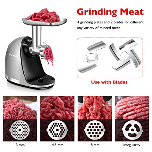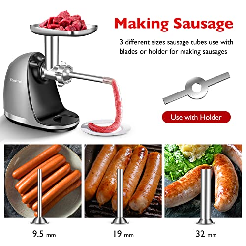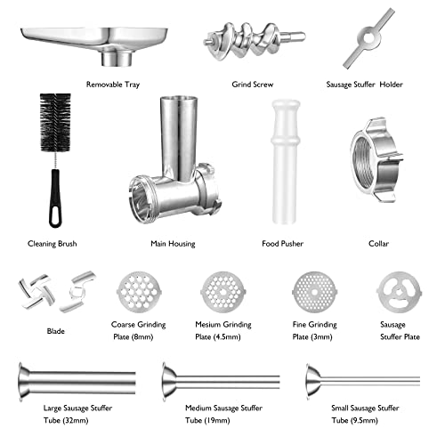 - 🥙【Multifunctional Food Grinder Attachment,Process All Meats Easily】 This meat grinder attachments produces ground meat with great texture.Superior in terms of speed, cleaner grind and durability.It includes as follows: a meat grinder device, 4 sizes of grinding plates, 3 sausage stuffing tubes, 2 grinding blades and a sausage stuffing holder, a removable food tray, food pusher and cleaning brush.Give you perfect experience of food processing, output healthy food materials efficiently.