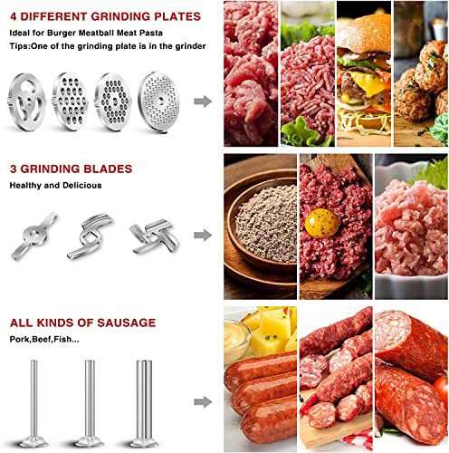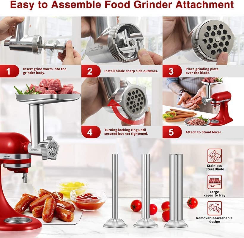 - 🎁【Multifunctional Meat Mincer Accessory, Process All Meats Easily】Superior in terms of speed, cleaner grind and durability. Includes a meat grinder device, 4 sizes of grinding plates, 3 sausage stuffing tubes, 2 grinding blades and a sausage stuffing holder, a removable food tray, food pusher and cleaning brush. Give you perfect experience of food processing. (Note: Meat grinder attachment only, KITCHENAID MACHINE IS NOT INCLUDED)