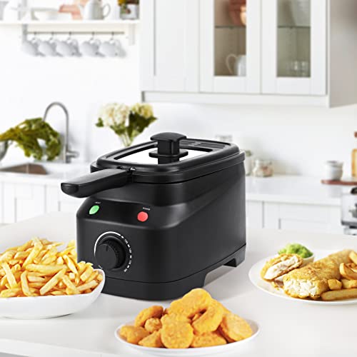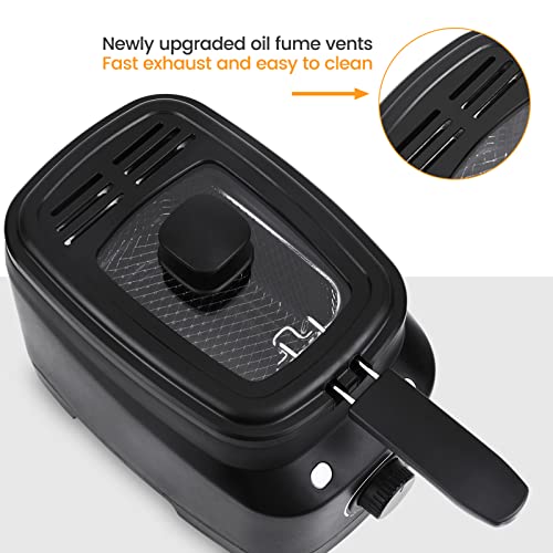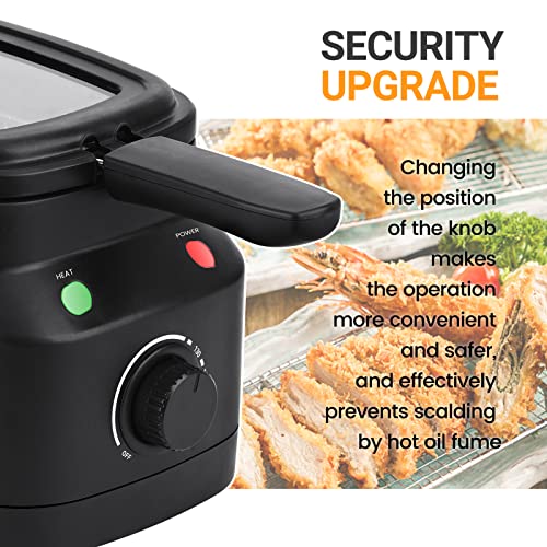 - [Easy Cooking] The separate power indicator and heat indicator can show you when the oil is ready in the deep fat fryer. The visible tempered glass lid is not only splash-proof, but also allows you to observe the frying process of the food. Cooking-oil(Max): 900ML & Cooking-oil(Min): 500ML