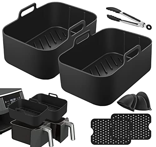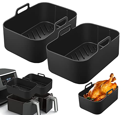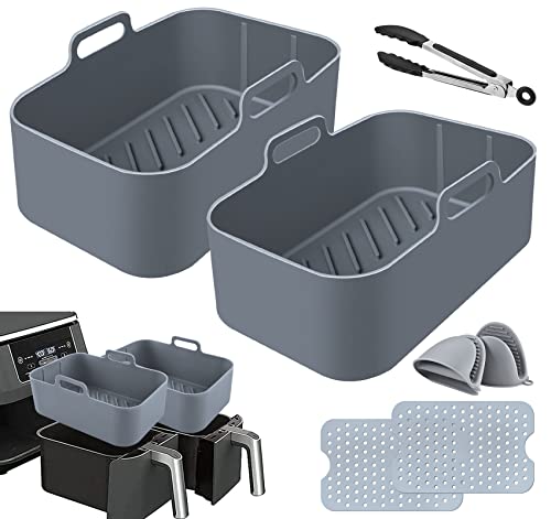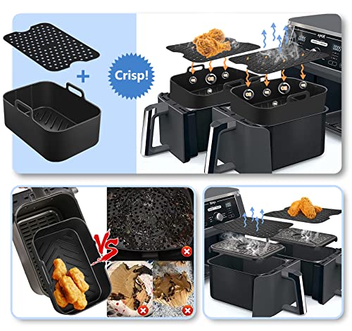 Product Description Our silicone air fryer liner specially designed for Ninjas Dual Air Fryer, The reusable silicone air fryer liner is more affordable, Great alternative to disposable paper fryer paper. Put the air fryer lining into the silicone pots use together to avoid the food being soaked in oil, which will make your food more crisp and delicious! Our silicone rectangle air fryer basket for the air fryer is soft and flexible, you just need to flip it inside out and wash it with warm water. Replacement for disposable air fryer paper liner ,non-stick, no odor, with good heat resistance (240° to -40°F). This air fryer silicone accessory is specially designed with dozens of soft silicone lines for better air circulation and even heat distribution to cook your food crispy! Our Air Fryer Accessories is not only suitable for air fryers, but also suitable for microwaves, ovens, steamers, cookers, steamer basket, freezer and dishwasher, stoves, etc. In addition, it can also be used for baking, grilling, serving food and fruit.