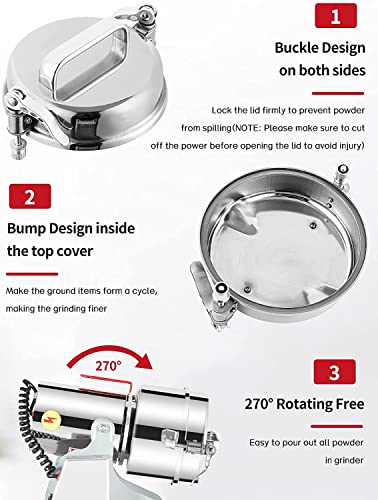 - STAINLESS STEEL BODY/BLADES & COPPER MOTOR - The whole body is made of high quality stainless steel and meets food safety requirements. Three-layer stainless steel blades and stronger copper motor make the grinder faster, quickly smashing dried materials in less than one minute.