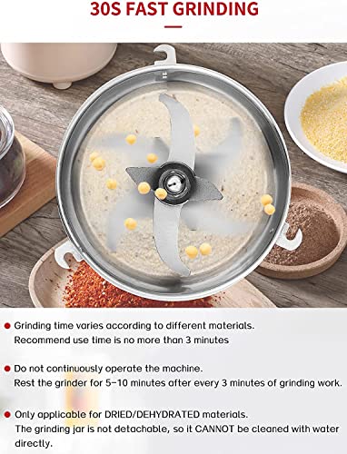- MULTIPURPOSE GRINDER MILL - Applicable to pulverize all kinds of dried materials, including grains, coffee beans, spices, seasoning and herbs, such as rice, soybeans, corn, wheat, salt, pepper, cumin, dried chili... 【NOTE】The material to be ground must be dry enough, no moisture and grease.