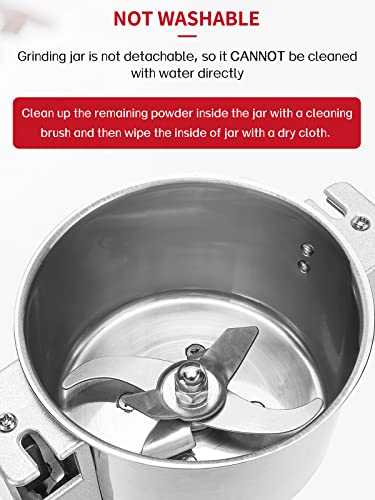 - 🌱 SPECIFICATION - Capacity: 300g/0.66lb; Grinding Degree: 50-300 Mesh; Working time: 5 minutes ; Interval time: 5 minutes; Rotating Speed: 28000R/Min ; Power: 1500W. ( * We're so sorry that there are minor scratches and pits cannot be avoided during the production and processing process. Hope dear you can understand : ) [Any questions or needs, contact us any time and we will provide you with quick response and the best help.]