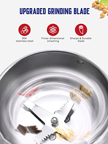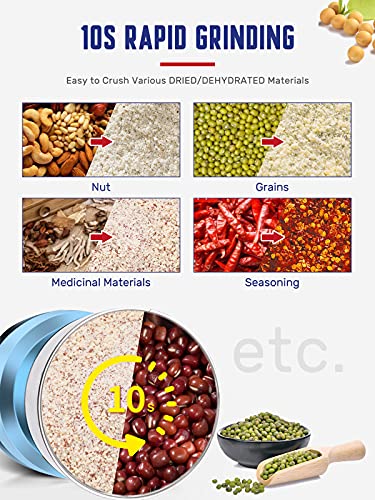- MULTI-PURPOSE GRINDING - Multi-function grain mill is perfect for daily use and can grind various DRIED/DEHYDRATED materials, including beans, peppers, chili, coffee beans, nuts, grains, cereals, spices, herbs, seasonings and so on. The nucleated or crusty materials should be removed the nuclear or the hard shell and then ground.