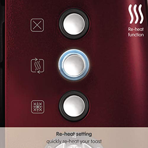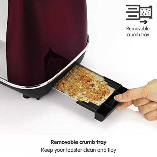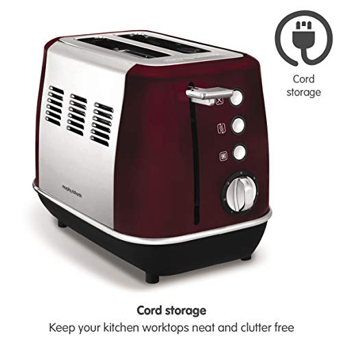 From the manufacturer Morphy Richards Red Evoke 2 Slice Toaster 224408 Evoke a reaction, create a new identity and add a touch of elegance to your kitchen with the new Evoke collection. The new Morphy Richards Evoke 2 Slice Toaster provides a stunning finish to complement any kitchen. The frozen, cancel and reheat settings ensure that your toaster is easy to operate, whilst the variable browning control means that your toast is perfectly cooked just to your liking. Easy to clean, simply remove and empty the crumb trays, plus it comes with handy cord storage to keep your worktop neat and tidy. For a fully coordinated look, pair with the matching pyramid kettle. Variable browning control ensures you get the perfect toast, just the way you like it Reheat setting allows you to quickly reheat your toast Frozen setting, for ease and convenience, so no need to defrost your bread first Removable crumb trays allow you to easily clean your toaster Cord storage to ensure your kitchen worktop stays neat and tidy Variable Width Slots The variable width slots ensure your toast is even, whether your slice is thick or thin. Browning Setting The variable browning control allows you to choose your desired browning level and it also allows you to reheat or defrost your toast. Crumb Trays The removable crumb trays make it easy for you to clean your toaster. Illuminated Buttons The Evoke toaster also comes with illuminated cancel, reheat and frozen function buttons.