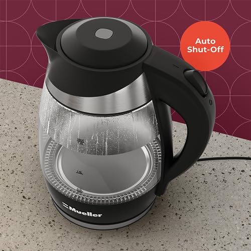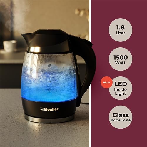 Mueller Ultra Glass Kettle M99S: 1850-2200W 1.8 Liter (60 fl oz) Electric Kettle Auto Shut-Off Boils Water Fast, Cordless with LED Light