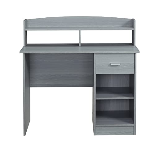 - Writing desk made of wood planks and grey veneer laminate surfaces.