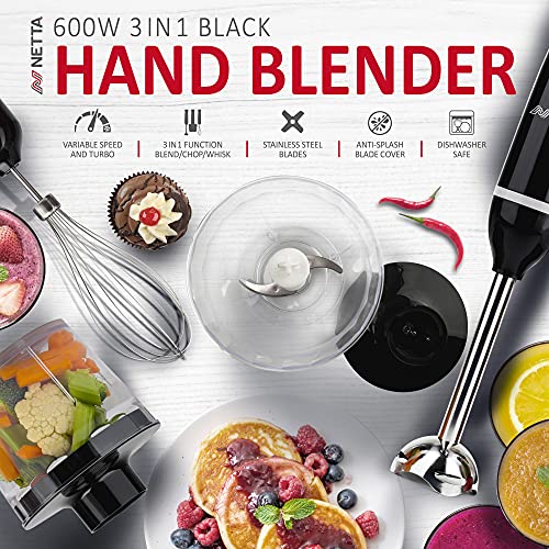 - 600W 3 IN 1 HAND BLENDER: This NETTA 3 IN 1 Hand Blender is simple and easy to use whilst delivering great performance and stylish looks, making it a great addition to any kitchen. With a powerful 600W motor it is the perfect appliance to create delicious smoothies and shakes, blend soups and sauces and so much more. The two activation buttons offer low and high blade speed, while finer adjustments between a range of 1 to 5 can be made using the rotary speed dial.