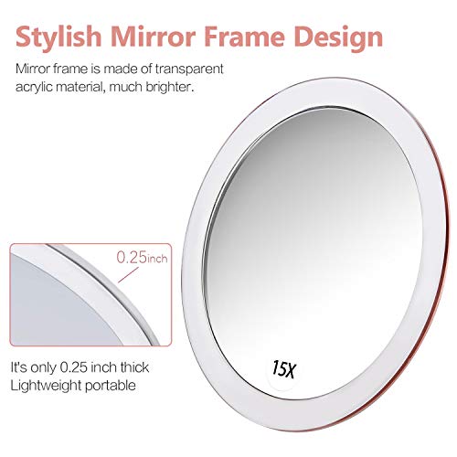 - [DISTORTION FREE 15X MAGNIFIED MIRROR] - Best facial skin care mirror with elegant transparent acrylic frame brings a brighter reflection. Great for applying makeup or daily facial treatments that require extra precision, such as blackhead removal, eyebrow tweezing and wearing contact lenses, etc