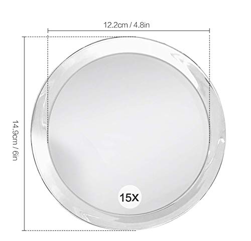 - [6 INCH MAGNIFYING MIRROR] - Most 15X vanity mirrors are not big enough to use. This circular 6 inch mirror shows you what you need to see while applying cosmetics or shaving. Make-up becomes faster and easier. The glass of mirror is a slightly curved. (4.8-Inch Viewing Area)