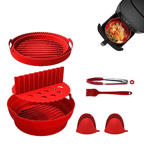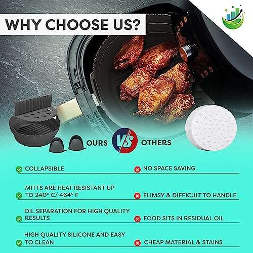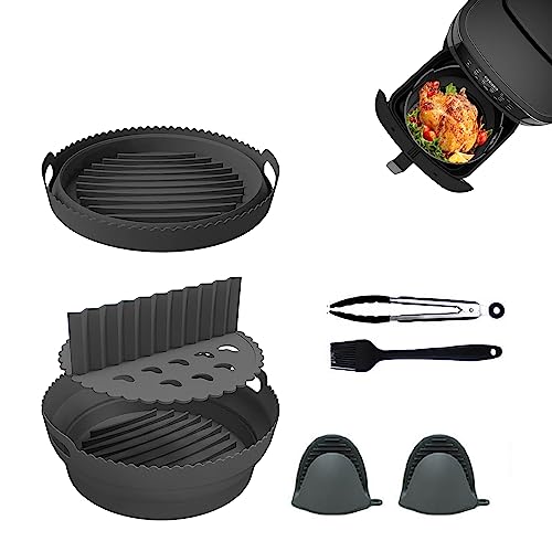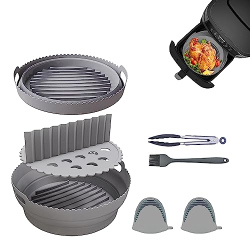 - 《VALUE ADD》Enhance your kitchen with our must-have airfryer accessories: Elevate your air fryer experience with our 5-in-1 silicone airfryer liners set, that include round shaped 8.3-inch silicone air fryer liner tray with a liner separator, two mitts, a food tong, and an oil brush, providing the essentials for a seamless cooking experience.