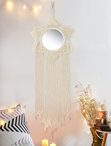 - ★【HIGH-QUALITY MATERIALS】This macrame round mirror is made of natural cotton thread, a sturdy metal ring and wear-resistant acrylic lens. The mirror shape refers to the sun and is elegant and chic.