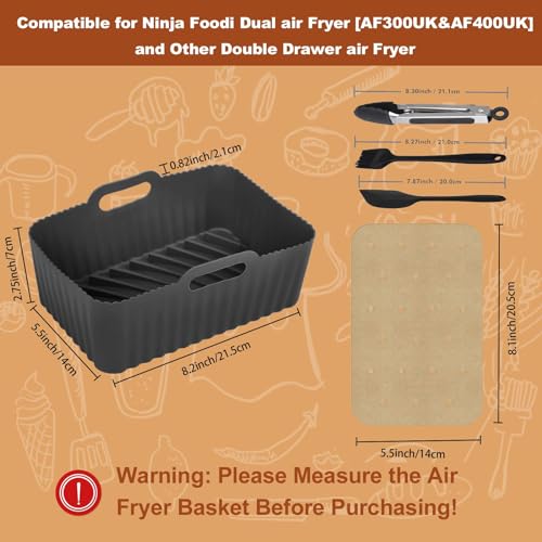 • Ninja Air Fryer Accessories - 2Pcs reusable silicone air fryer liners & stainless steel air fryer rack, oil brush, food tongs and 100 paper lining suitable for Ninja AF300UK/AF400UK / Tower T17088 and other dual-zone air fryer like Tower, Instant Vortex, EMtronics.