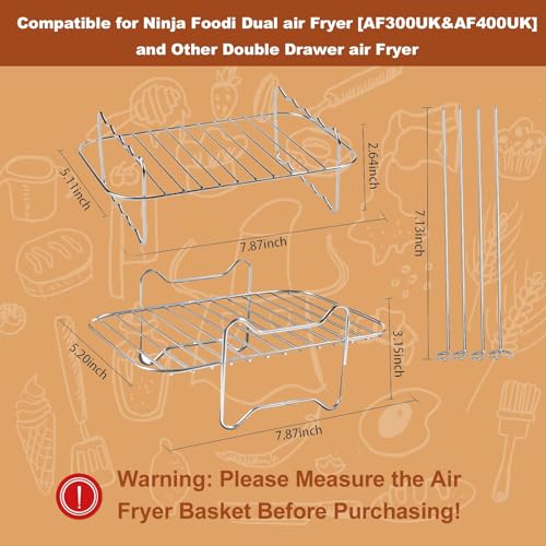 • Multifunction Air Fryer Rack - 2Pcs Air fryer rack for Ninja Foodi Dual Zone Air Fryer, layered stainless steel rack with 4 skewers suited for grilling, baking, dehydrating and reheating, expands your cooking area effectively, allowing you to cook more dishes at the same time.