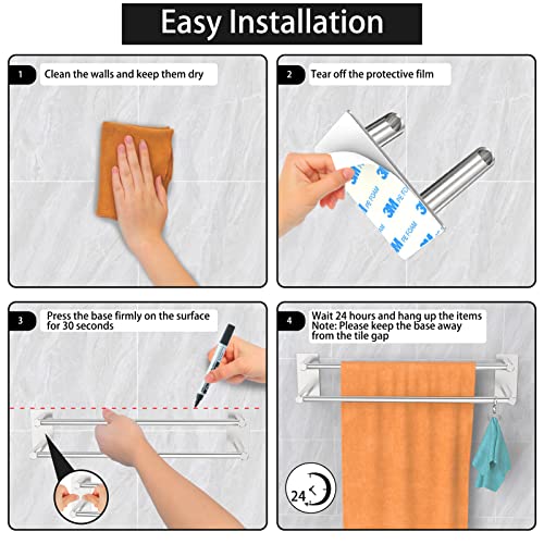 - 【Drill-free installation】: Bathroom Towel Rail simply peel off a film adhesive pad without drilling or other tools and stick it to the smooth wall surface, wait 48 hours before you can use it. The sticky pad is strong adhesive and can withstand 3-5 kg.