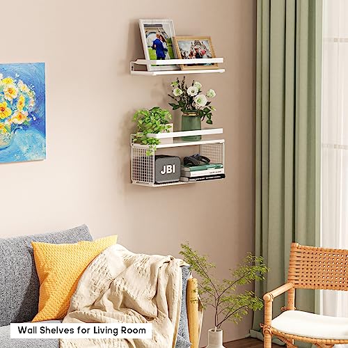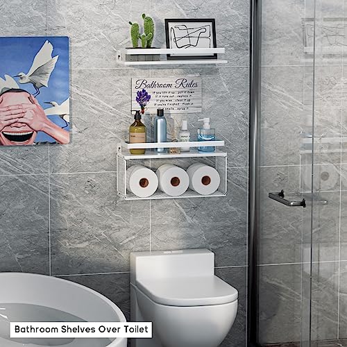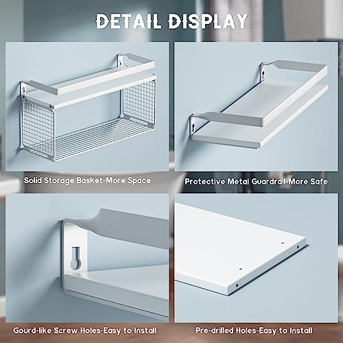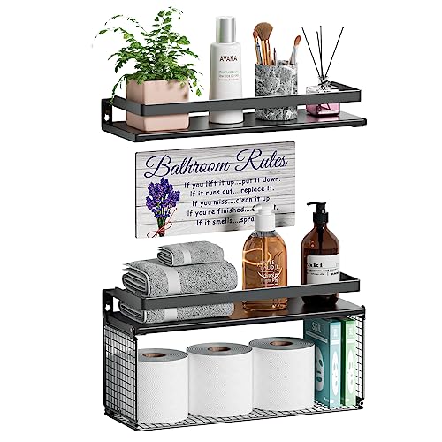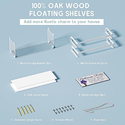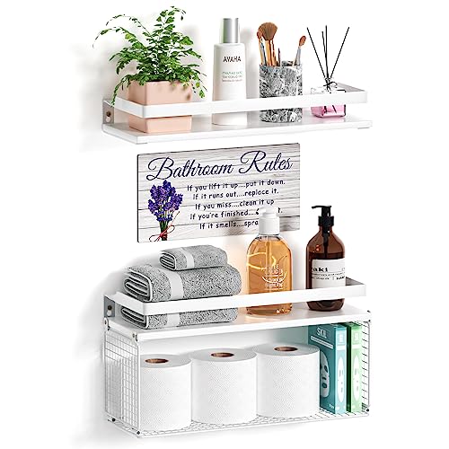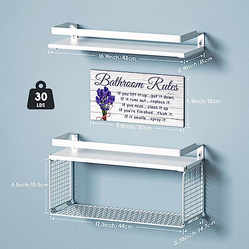 Nunemosk Set of 2 Bathroom Floating Shelves with Wire Storage Basket 43cm Wall Mounted Bathroom Shelves with Bathroom Wall Décor Sign for Wall De