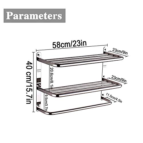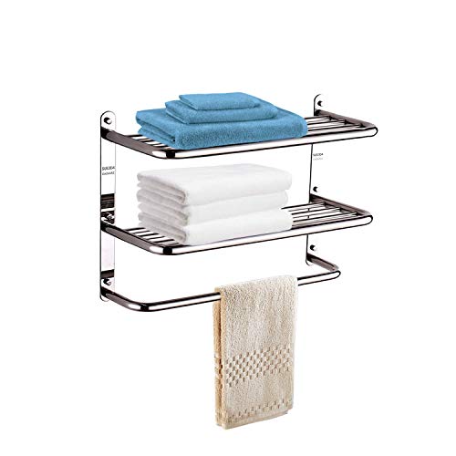 - [Design]:3-Tier design, Featuring two 23"*10" upper storage shelf and a lower towel bar. Our towel shelf has large storage space for you to stack bath towels, clothing or other items, so that you can organize your items better. Rounded corners, not only beautiful but also to prevent hand injury from the use of safety.