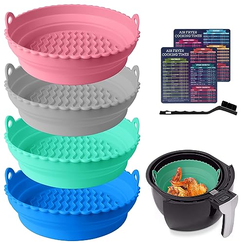 - 1.【Pot for 4 to 8 QT】: You will receive 4 different colors (mint green, blue, gray, pink) of air fryer silicone liners, 2 cooking air fryer cheat sheet, and 1 cleaning toothbrush, perfectly suited for your daily use and replacement. air fryer liners measures 8 inches at the top and 6.7 inches at the bottom and fits 4 to 8 quarts, please check the size chart carefully before ordering to make sure it fits your needs.