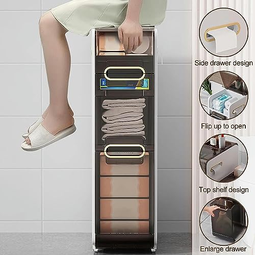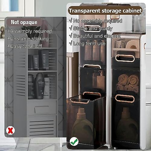 - 【Highlight design】This tall slim bathroom floor cabinet is built on four raised feet,and for ease of movement,there are two rolling casters on the rear wheels.The high and thin narrow storage drawer cart design features semi transparent drawers and widened handles,making it easy for you to identify items and store them smoothly