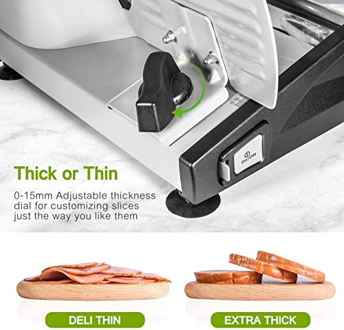 - To be a chef: The food slicer cuts the food precisely, it makes you like a GOOD chef at home. Adjustable thickness from super thin to approximately 15mm thick for slicing various of food such as meat, deli, cheese, roast beef, turkey Breast, vegetables and fruits.