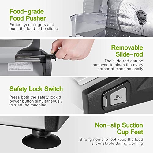 - Safety protection: To operate the deli slicer, you must press both the safety lock & power button simultaneously to start, avoid the mistake operation. Non-slip suction cup feet keeps the meat slicer stable during working.