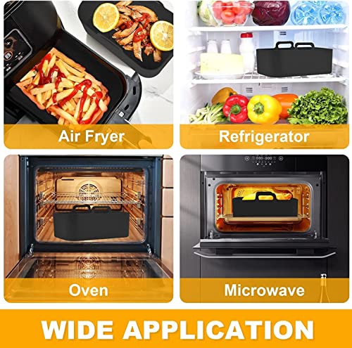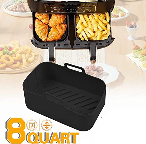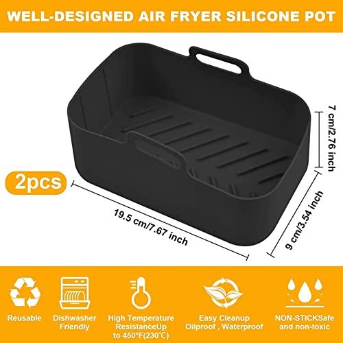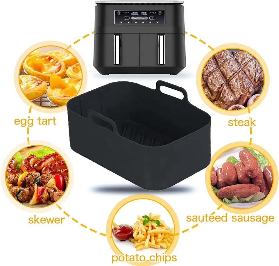 - [PRACTICAL DESING] The air fryer liners silicone is designed with dozens of soft silicone lines, which helps to circulate air better and distribute heat evenly, making your food more delicious the best airfryer accessories . The handles on both sides to protect your hands from burns when taking out it. One package includes 2 pieces air fryer silicone pot for air fryer with dual basket.