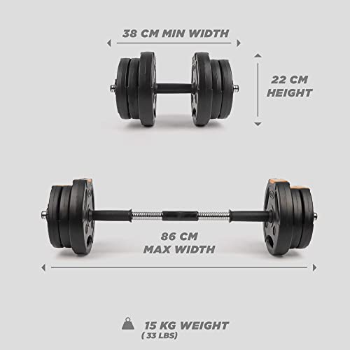 - SPECIFICATION: Easy Assembly & Disassembly | SET INCLUDES: Weight Plates: 15kg (4x 2.5kg & 4x 1kg), 2x 0.5kg Handlebars, 1x Locking Bar, 4x Spinlock Collars | Anti-Roll Design | Material: Stainless Steel & TPU | Dimensions: Height: 22cm | Minimum Length: 38cm | Maximum Length: 86cm