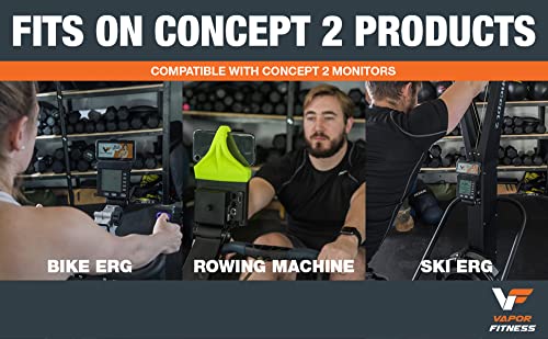 - PATENT PENDING DESIGN: The silicone smartphone holder slides on top of the Concept2 PM5 monitor and fits snugly. It is reinforced at the back with a third rib for stability. This product comes in black or neon yellow and is made of high quality silicone.