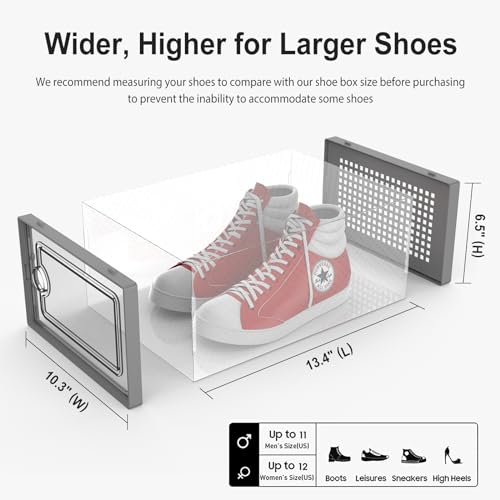 - 【Wider&Larger for Capacity】The upgraded x-large shoe box is wider and higher with 13.4"L x 10.3"W x 6.5"H.Fits for women's shoes up to size 12(US) and men's shoes up to size 11(US).Provide a storage space for all types of shoes in closets, entryways or hallways.(Warm tip, please see if your shoe size is suitable first.)