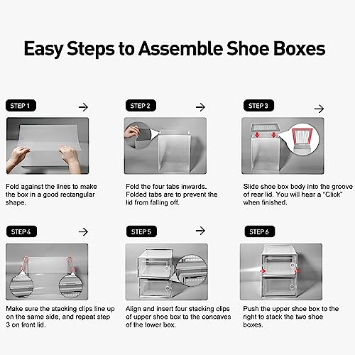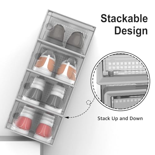 - 【Stable & Stackable】:This stackable shoe box has a simple slot lock design makes it easy to stack the shoe boxes together which is more stable for free combinations and easy to move. All you need to do is "insert and push" to complete the stacking. The shoe boxes use side buckles to lock. It locks firmly and can be flipped 360° after stacking.