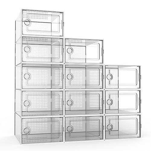 - 【Say Goodbye to Mess】: This 12 pack clear shoe organizer makes your shoes organization neater and more tidy.Compared with shoe rack,which is amazing for dust free and maximizing storage space.It also can be a big help to neatly organize your closet, hallway and bedroom or use it to store scarves, books, toys and games.