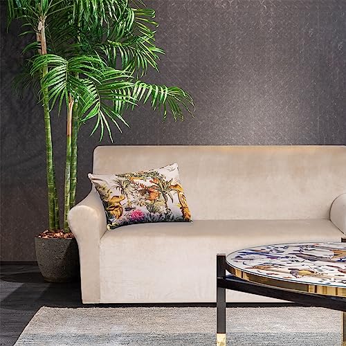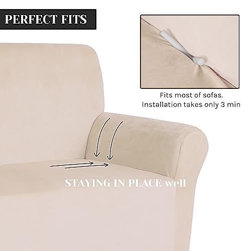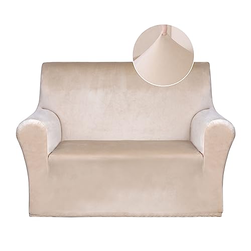 - NICE-FITTING——This elegant beige loveseat cover fits most home furniture sofas. It is easy to fit various kinds of couches (Pls measure the size in advance according to the dimension drawings on the picture.) .Anti-slip foam roller prevents the couch covers for sofa slipping off.Soft cord can easily adjust the position of the loveseat slipcovers