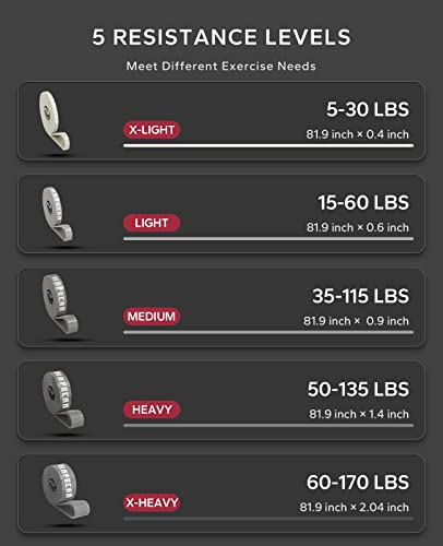 • 【5 Pcs with Varying Resistance Levels】Our pull up assistance bands comes with 5 resistance levels, which increase in layers, and you can switch combinations freely. X-LIGHT: 5-30 LBS, LIGHT: 15-60 LBS, MEDIUM: 35-110 LBS, HEAVY: 50-135 LBS, X-HEAVY: 60-170 LBS. The avant-garde and fashionable gray gradient colors will bring you a completely different experience in vision and use.