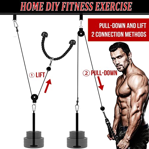 Product Description Silent Pulley Stainless Steel Head, Free Swivel. Reinforced Nylon Wheel, Diameter 90mm. The Grooves are Deep and Safe. Silent and Smooth, No Breakage Max load of 220LBS Steel Bottom Cover and PCV Gasket Tighten the Screws on both ends. Safe and Secure, won't break. Maximum Weight Capacity 220 lbs. Tricep Rope Stainless steel connectors to match any machine Bottom plastic thick bottom head for safe exercise Thicker nylon rope braid to enhance durability Lengthen Nylon Rope 100'' length and 3/8'' thicker Double Braided Nylon Rope Decreased stretch and increased shock absorption 2021 Latest Upgraded DIY Fitness LAT Pulley Cable System Taeku Fitness DIY Cable Pulley System is designed for users who want to keep a regular practice on physical strength and muscle workout at home. Equipped with professional components and made of premium material to make sure the utility and safety of your exercise. By changing the connection ways and switching the tricep rope and straight bar, you can do a wide range of exercises. Super easy-assembling and convenient-carrying enables you to workout whenever and wherever, home, garage,park and various workout environments. Package: 1* Loading Pin 1* 100'' Nylon Rope 1* Silent Pulley 1* Strap 1* Tricep Rope 1* User Manual 3* Hoist Buckles