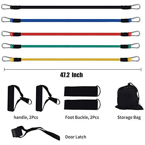 Product Description Use our Resistance Bands to exercise all parts of your body. According to different parts, use tension band to exercise muscles in different places, so that your body lines are more solid, beautiful and slim. 5 Bands with Various Resistance Black: 30lbs; Blue: 25lbs; Red: 20lbs; Green:15lbs; Yellow: 10lbs Sturdy Stainless Steel Carabiners Made of stainless steel, the carabiners are sturdy and durable. They’re rust-proof and anti-break, ensuring your every exercise is safe. It can exercise your arms, chest, legs, hips, trunk, back, etc. Resistance band with handles is made of premium rubber latex, which is elastic and it can withstand strong extension, durable for long time use and safe. It can be used in fitness enthusiasts, body building, weight loss, office workers, students, middle-aged and old people exercise recovery Our tension rope is composed of five kinds of ropes with different strength. You can combine different tension ropes according to your own corresponding tension value. We suggest that at least 2 tension belts should be combined for training each time to improve the training effect Resistance Bands set All accessories are packed in one package: the package contains 11 items, 5 resistance bands, 2 handles, 2 ankle bands, door anchors and a handbag.