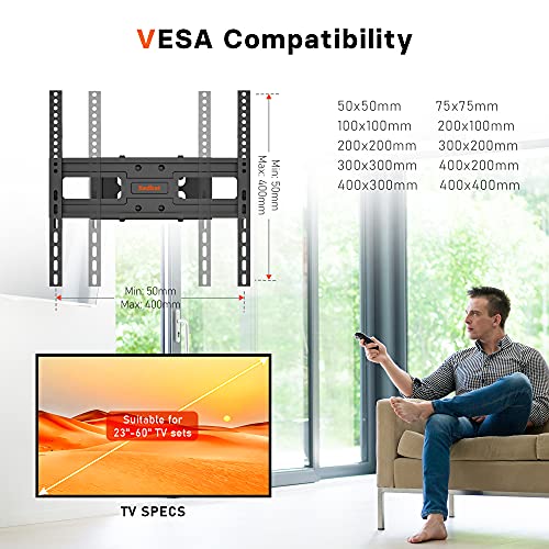 - Universal Compatibility: Universal for most 23-60 inch flat & curved TVs of almost all brands with MAX weight capacity of 45kg. It fits VESA patterns 400x400 / 400x300 / 400x200 / 300x300 / 300x200 / 200x200 / 200x100 / 100x100 / 75x75 / 50x50mm. Please check the VESA pattern, weight, and size of your TV before purchasing.
