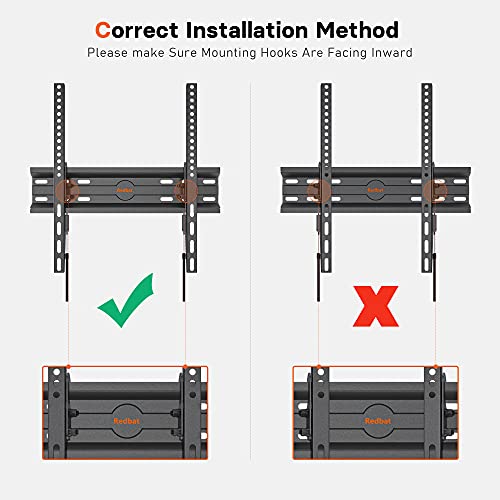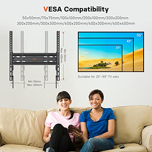 Product Description Low Profile TV Wall for Your Room This TV wall mount is ideal for 23''- 55'' flat and curved TVs up to 45 kg with VESA holes from 400x400 to 50x50mm to offer a neat appearance even your room is small, and its tilt can improve your viewing experience. A Tilt of 15 Degrees A tilt of 15 degrees enabled by this TV wall mount allows you to choose the most comfortable angle so you can have a better viewing experience and it can also eliminate annoying glare & reduce neck or eye strain. Safety Lock Integrated spring lock can automatically be locked with the help of the weight of your TV during installation. 30mm Slim Design Low profile design of just 30mm from the wall, allowing you to mount your TV almost flush with the wall to save space. Will this Mount Fits Your TV? Just make sure your VESA size, your TV size, TV weight, and wall type fits the following: Your TV should be less than 45 kg. Your TV VESA standard is one of the following: 400x400/ 400x200/ 300x300/ 300x200/ 200x300/ 200x200/ 200x100/ 100x100/ 75x75/ 50x50mm. Your TV size should be between 23 inches and 55 inches. This mount is suitable for wood studs, concrete wall and brick wall. How to remove your TV Make sure to pull the two strings with both hands at the same time when removing your TV. Lift your TV while pulling the two strings down, the safety loch downwards will leave the plate slot first and then you can remove the hooks.
