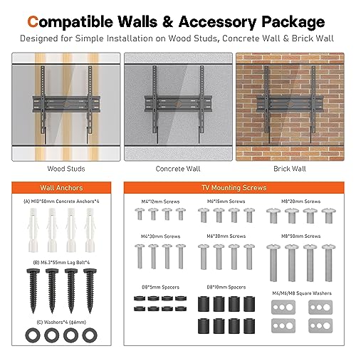 - Easy Installation: Even a beginner can easily install this TV wall bracket within minutes. Your TV will automatically mount on the panel and can be released with the spring locking system, quickly and easily. The wall mount comes complete with all necessary accessories: 4x expansion tapping screws, a spirit level, 5 cable ties, and easy-to-understand instructions, including an installation video available in position 7 in our pictures.